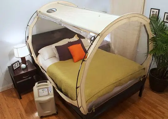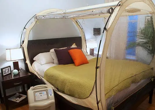 This is Hypoxico’s most universal altitude tent training system. It’s ideal for traveling to and from events and can also be used permanently in your home. Fits twin through queen sized mattresses. This altitude tent provides comfortable altitude environment allowing moisture out through the specially designed fabric. The Portable Altitude Tent fits on the box spring of a queen/king size bed with the mattress inside, or on the floor with a twin/double/queen mattress inside.
