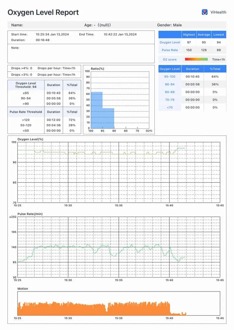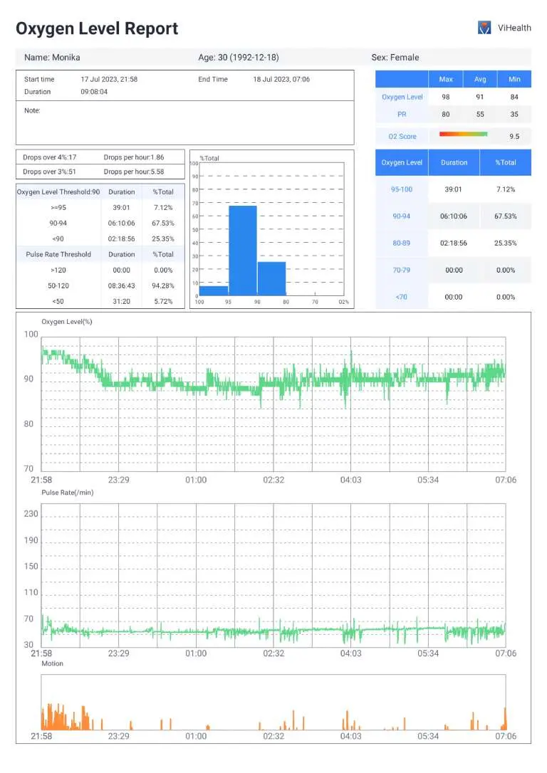 - Track and record oxygen level, heart rate and motion